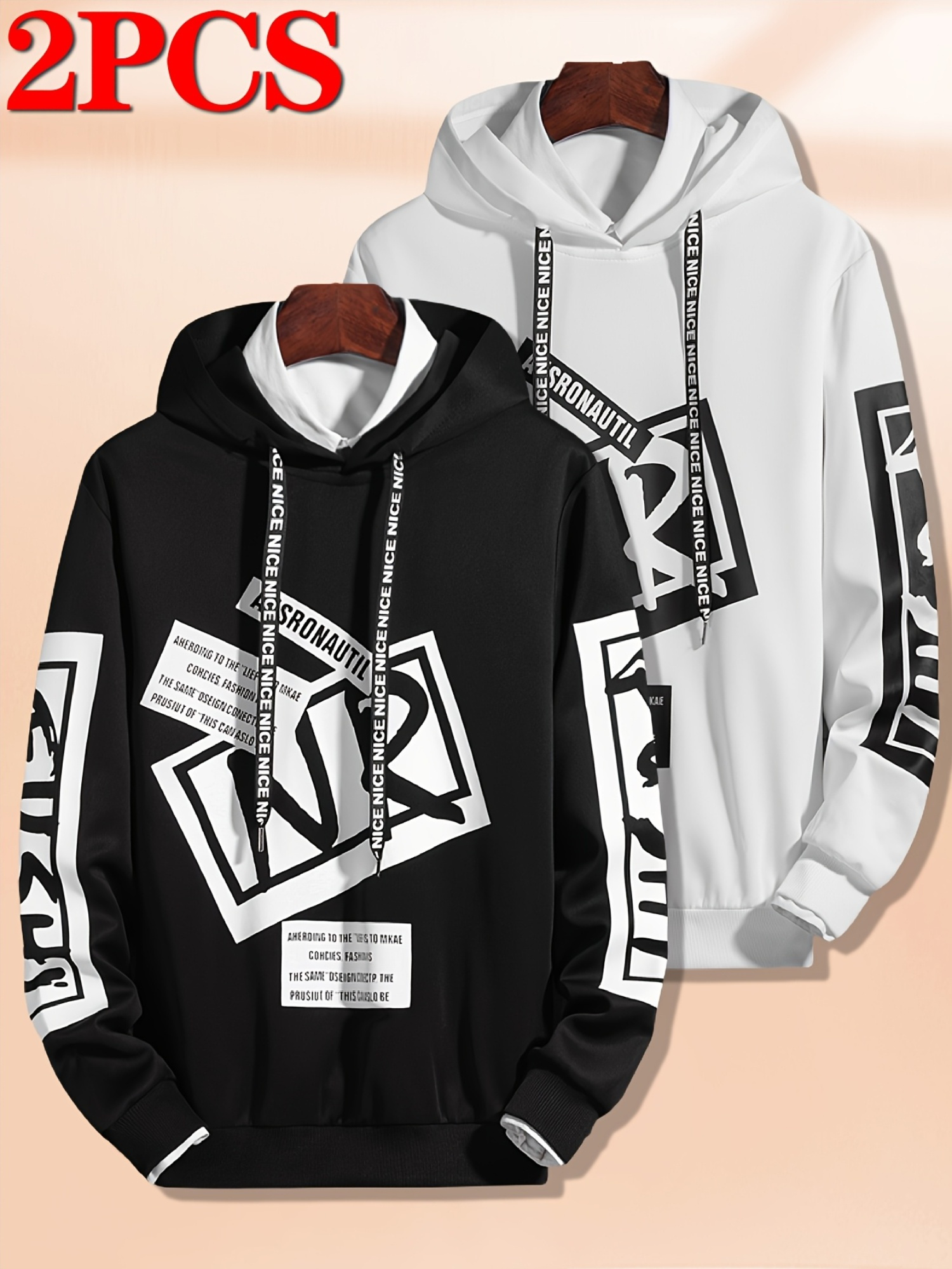 2-Pack Men'S Casual Long Sleeve Hooded Sweatshirts, Polyester Knit Fabric with Slight Stretch, Regular Fit, Alphabet Pattern, Sports Style Hooded Pullover for Outdoor, Leisure & Athletic Wear
