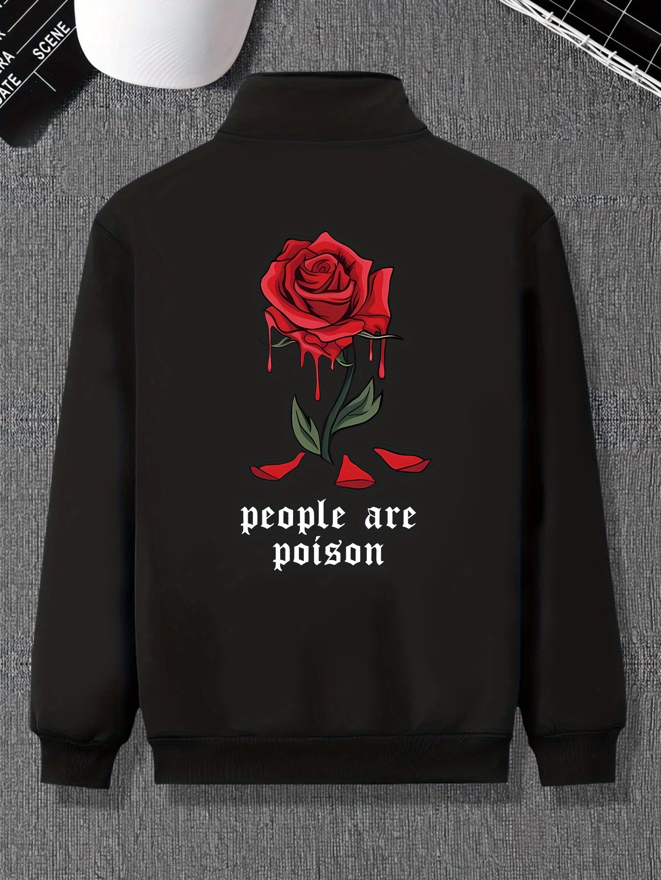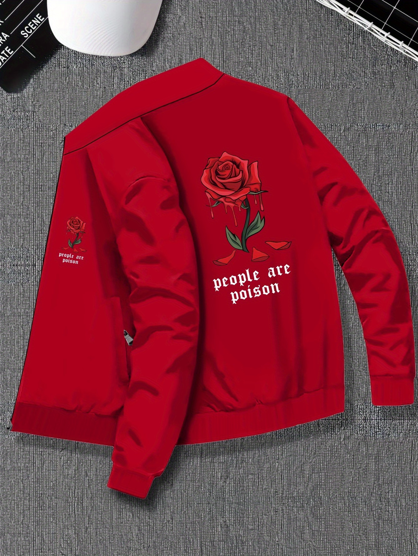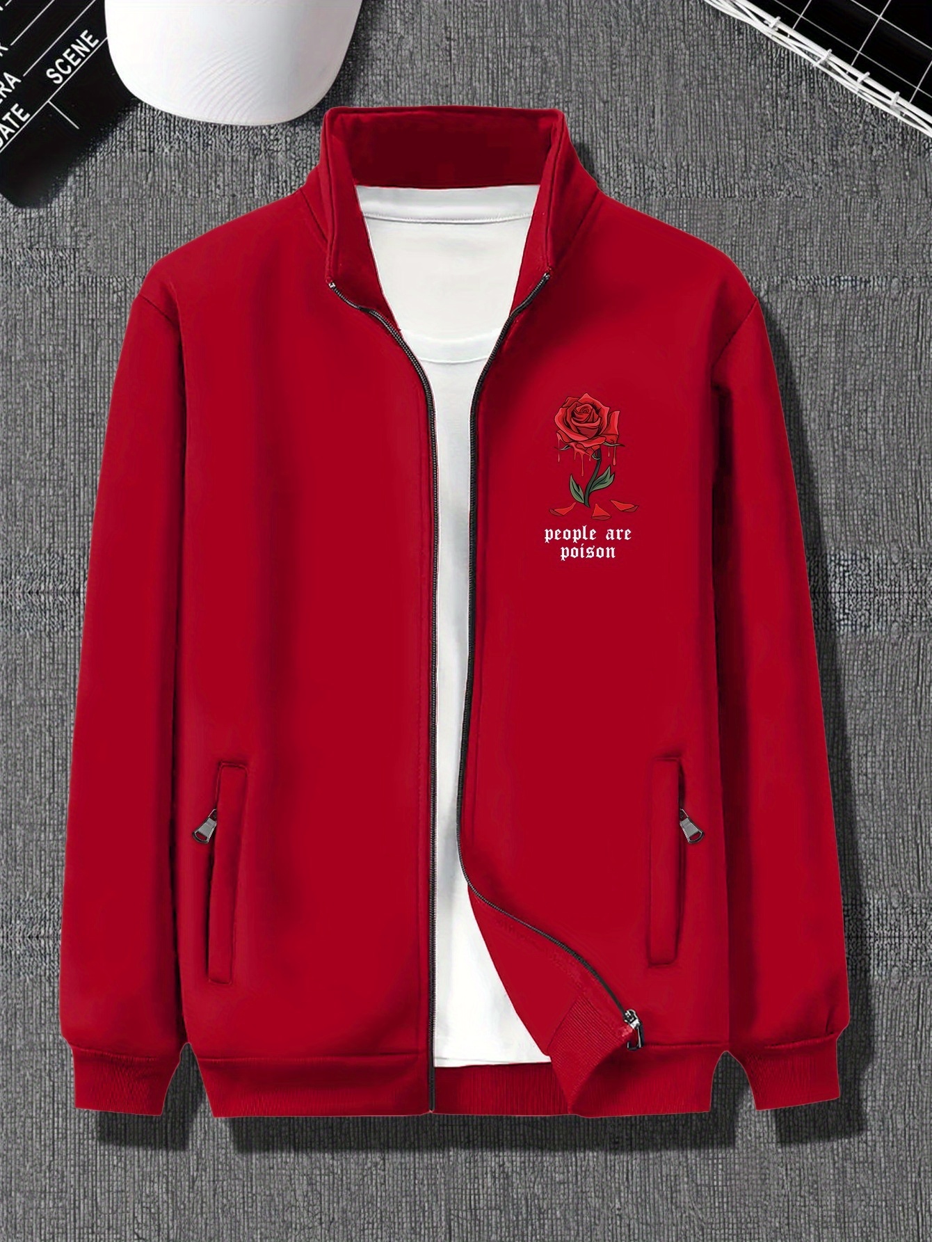 Casual Varsity Jacket for Men - Knit Polyester Blend, Regular Fit, Stand Collar, Slight Stretch, Classic Rose Print Detail