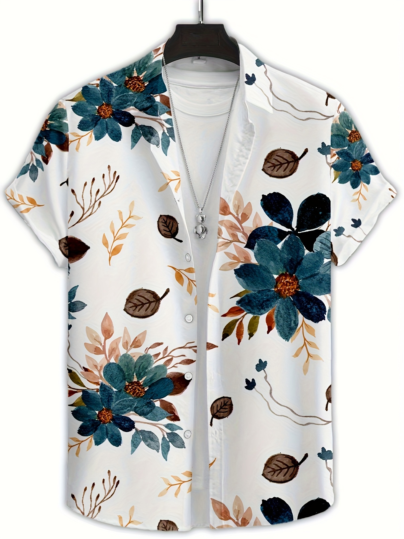Men'S Floral Print Short Sleeve Shirt - 3D Print Blue, Orange & Brown Flowers & Leaves, Casual Summer Style with Button-Up Collar, Lightweight Polyester Fabric for Casual Attire, Floral Shirt