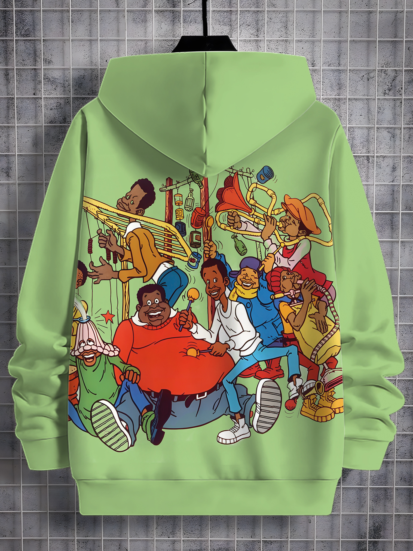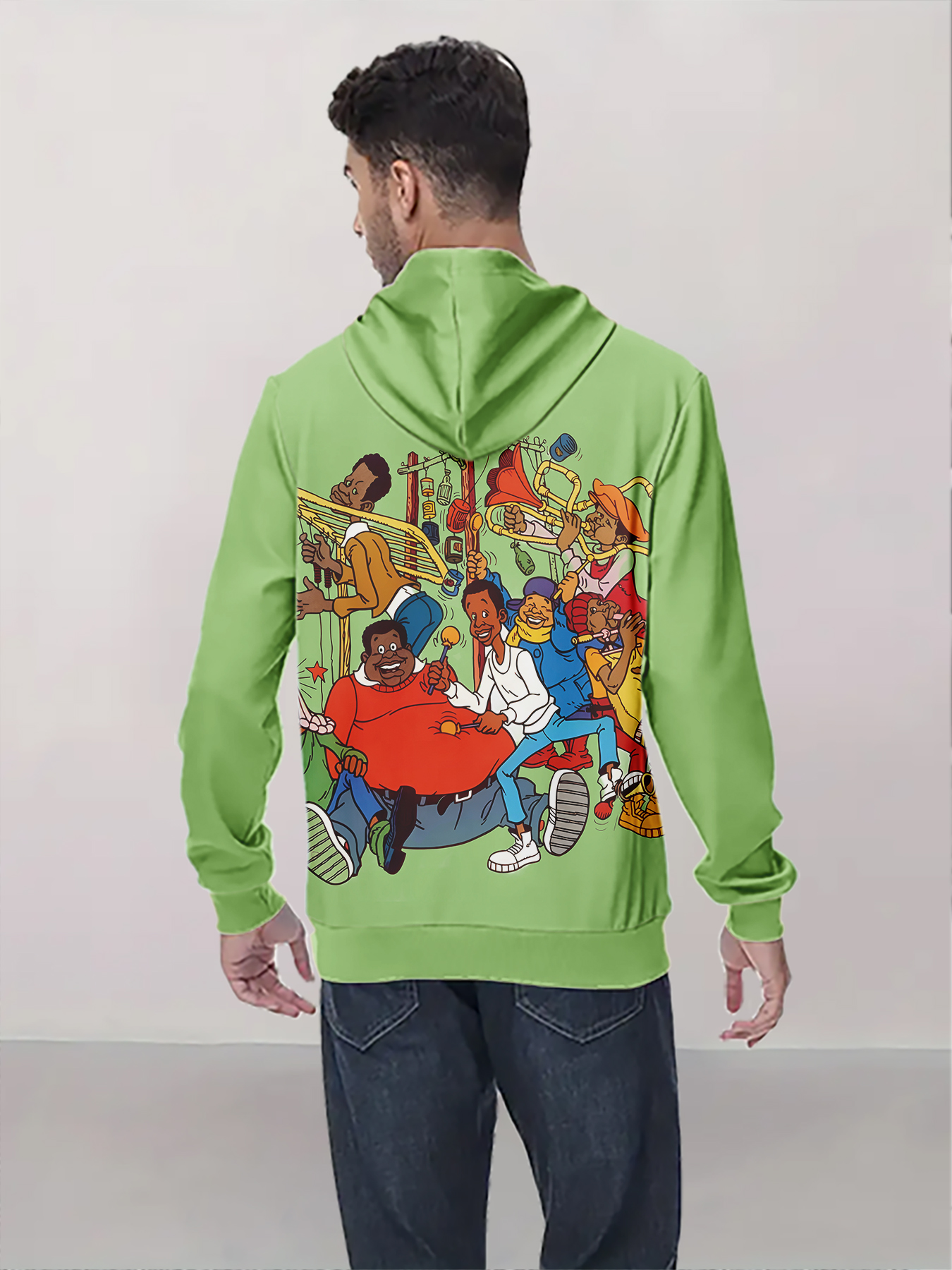 Lime Green Men's 3D Funny Cartoon Graphic Hooded Sweatshirt with Music Band & Retro TV Print, Soft Warm Pullover for Autumn Winter Casual Wear, Machine Washable Digital Hoodie for Themed Parties & Everyday Outfits
