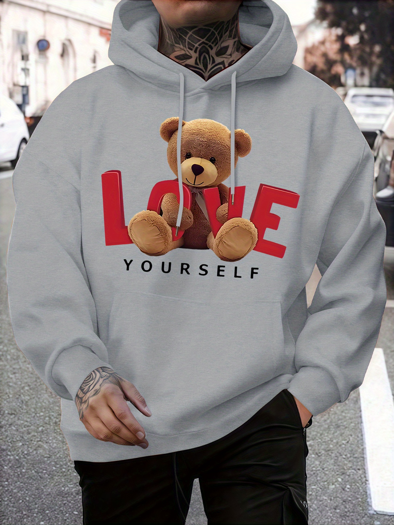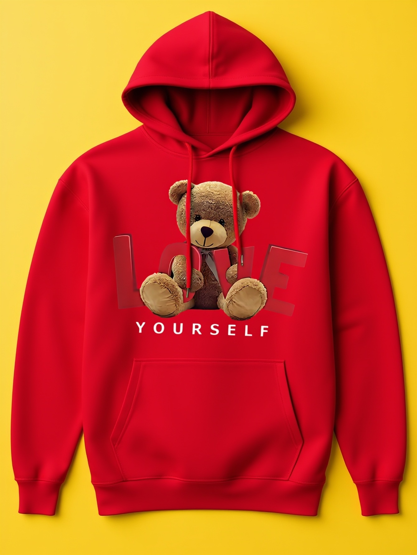 Men'S Casual Hooded Sweatshirt with "Love Yourself" Teddy Bear Print - Cozy Red Pullover for Winter, Soft & Comfortable, Perfect for Casual Attire, Casual Wear Hoodie | Teddy Bear Design | Comfortable Fit, Sweater Hoodie