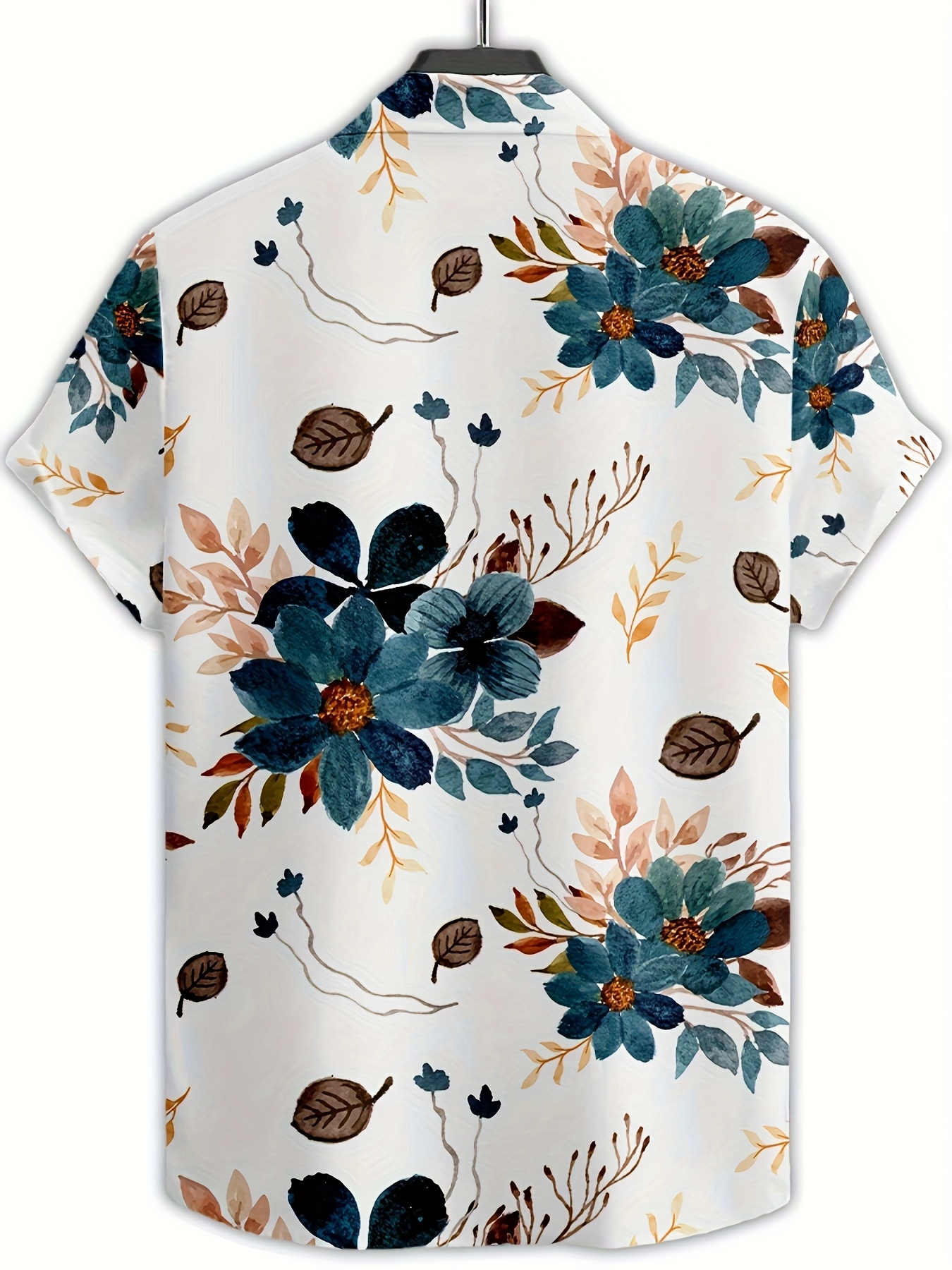 Men'S Floral Print Short Sleeve Shirt - 3D Print Blue, Orange & Brown Flowers & Leaves, Casual Summer Style with Button-Up Collar, Lightweight Polyester Fabric for Casual Attire, Floral Shirt