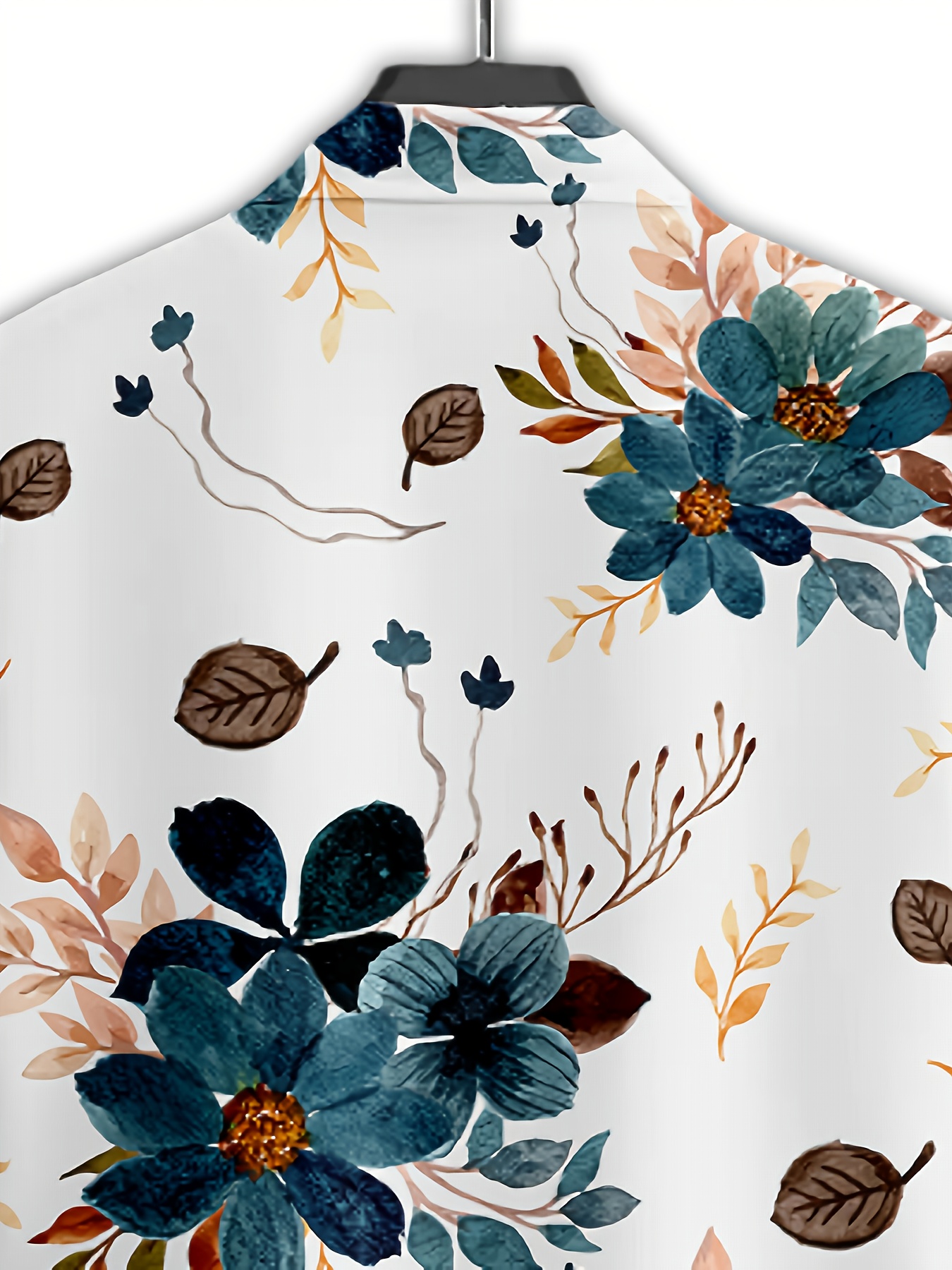 Men'S Floral Print Short Sleeve Shirt - 3D Print Blue, Orange & Brown Flowers & Leaves, Casual Summer Style with Button-Up Collar, Lightweight Polyester Fabric for Casual Attire, Floral Shirt
