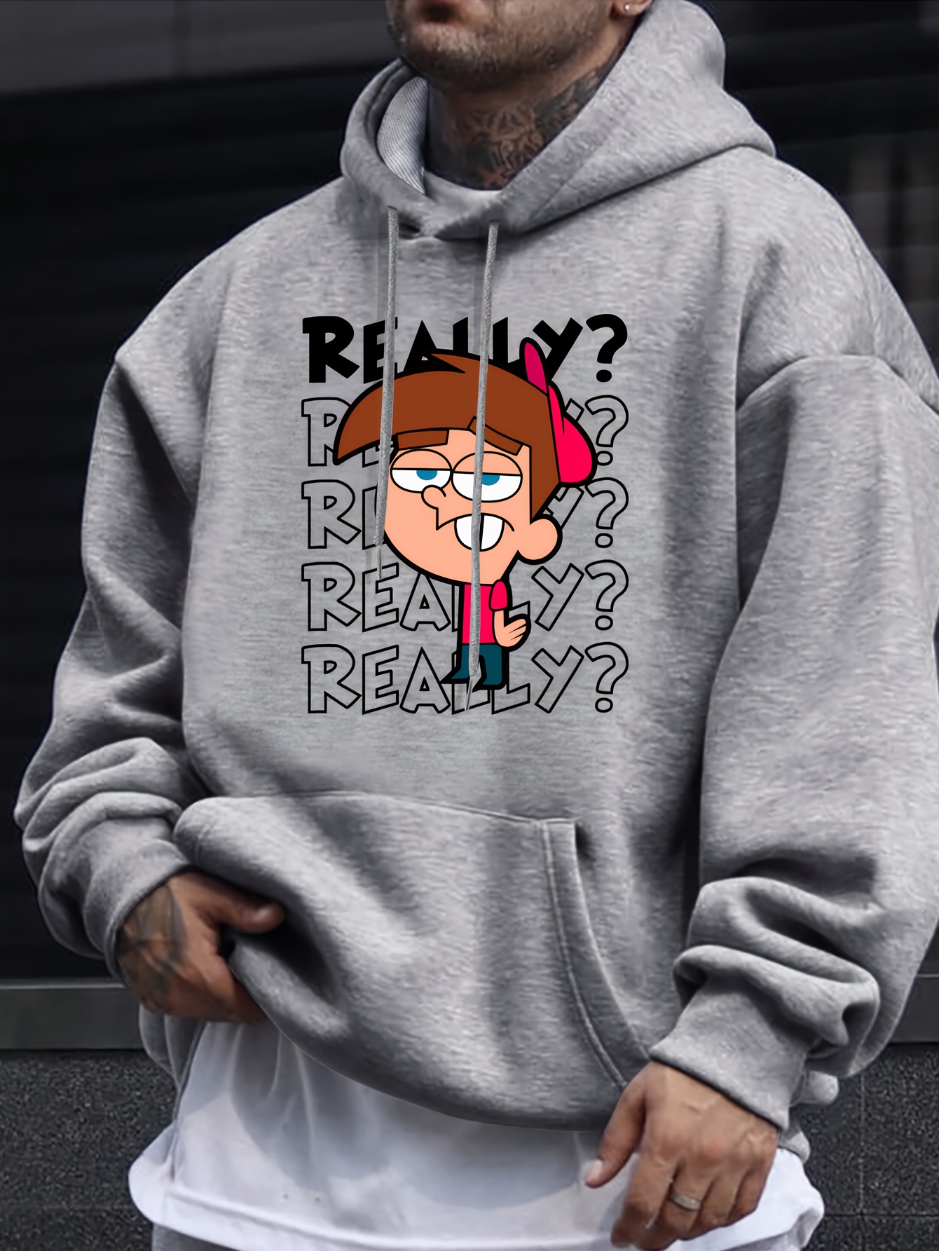 [Cozy Cartoon Hoodie] Cozy Comfort Cartoon Print Men's Hoodie | Long Sleeve Pullover with Fun Animated Character Design, Light Gray, Perfect for Fall and Winter