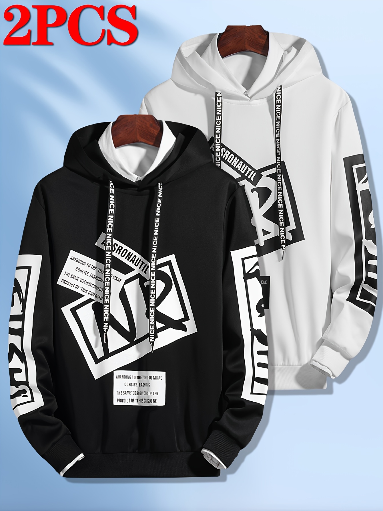2-Pack Men'S Casual Long Sleeve Hooded Sweatshirts, Polyester Knit Fabric with Slight Stretch, Regular Fit, Alphabet Pattern, Sports Style Hooded Pullover for Outdoor, Leisure & Athletic Wear