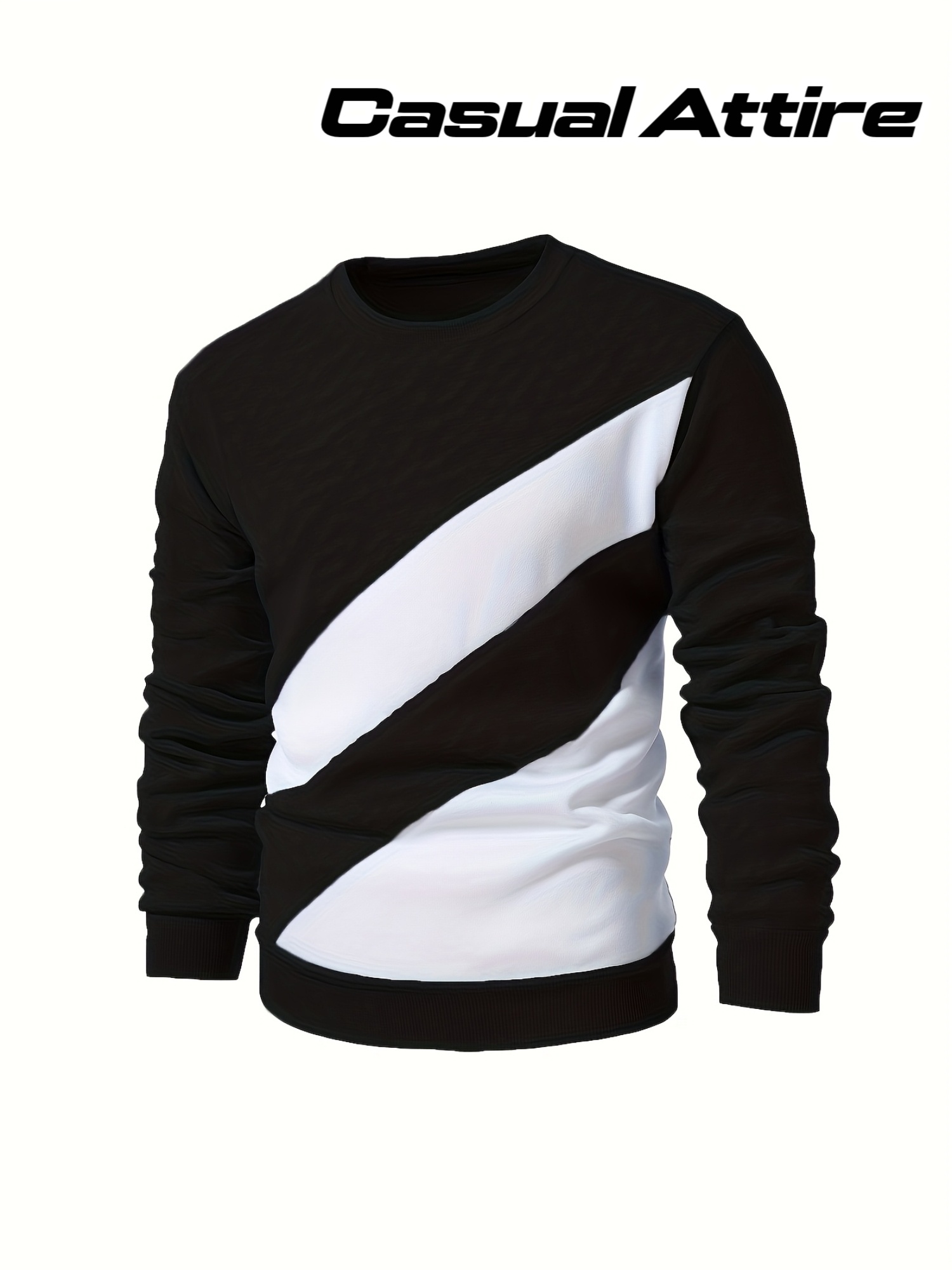 [Casual Geometric Stripe] Men's Casual Geometric Stripe Sweatshirt | Black & White Crew Neck Pullover | Comfortable Knit Fabric | Long Sleeve Hoodie